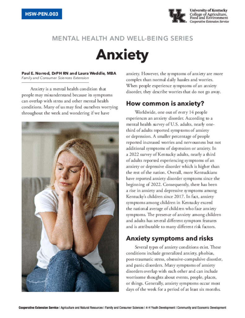 Anxiety Anxiety Authored by: Paul Norrod Download Publication Publication ID HSW-PEN.003 Contact Natese Dockery Subject Area Mental Health and Well-Being Series