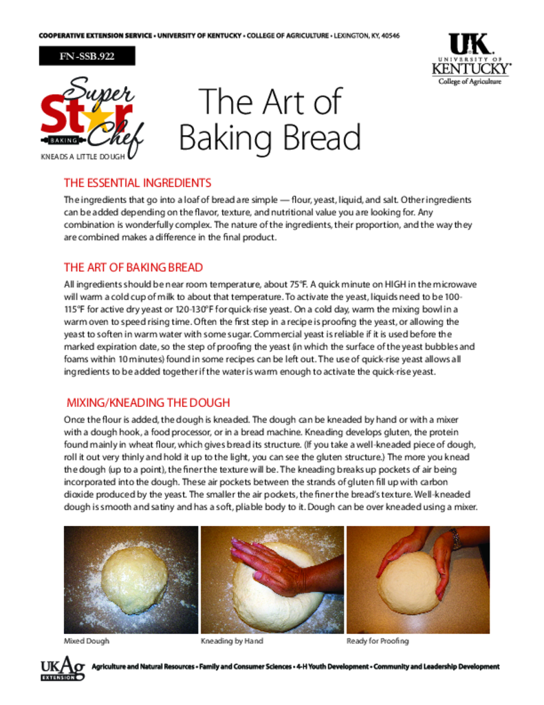 The Art of Baking Bread The Art of Baking Bread Authored by: Sandra Bastin Download Publication Publication ID FN-SSB.922 Publication Date December 1, 2010 Revision Date December 1, 2014 Contact Tanya Whitehouse Subject Area Baking Publication Supplemental Materials Available! Please login to view supplemental materials.