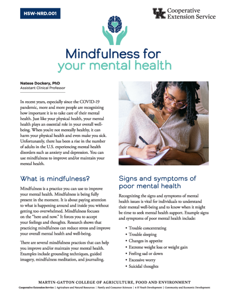 Mindfulness for Your Mental Health Mindfulness for Your Mental Health Authored by: Natese Dockery Download Publication Publication ID HSW-NRD.001 Contact Natese Dockery Subject Area General Publication Supplemental Materials Available! Please login to view supplemental materials.