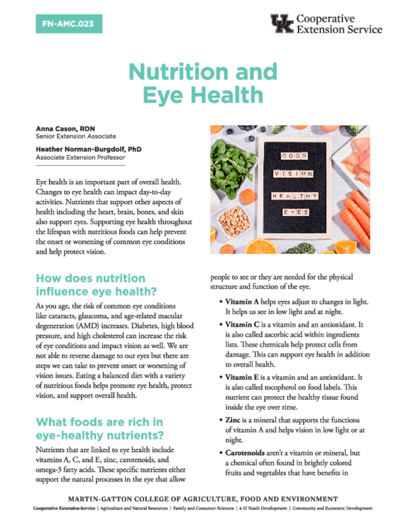 Nutrition and Eye Health Nutrition and Eye Health Authored by: Anna Cason Download Publication Publication ID FN-AMC.023 Contact Anna Cason Subject Area Nutrition and Health Conditions