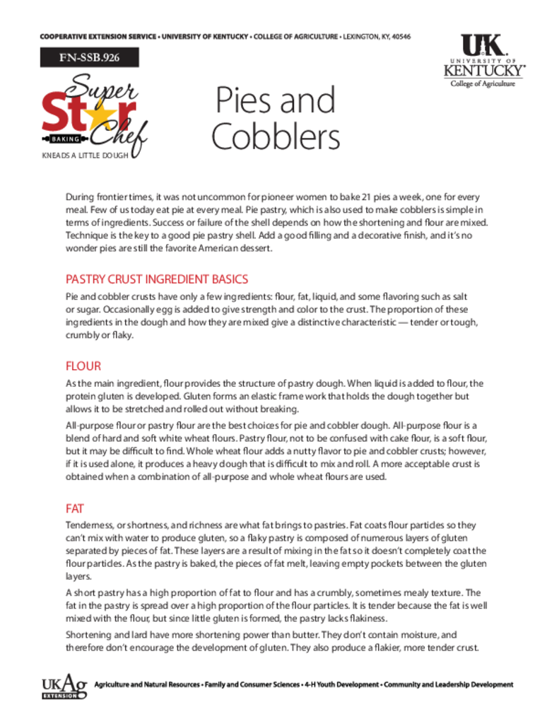 Pies and Cobblers Pies and Cobblers Authored by: Sandra Bastin Download Publication Publication ID FN-SSB.926 Publication Date December 1, 2010 Revision Date December 1, 2014 Contact Tanya Whitehouse Subject Area Baking Publication Supplemental Materials Available! Please login to view supplemental materials.