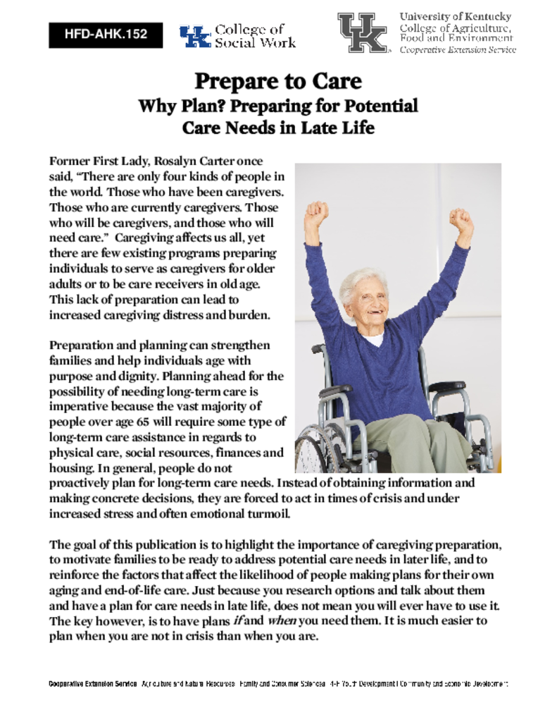 Prepare to Care Why Plan? Preparing for Potential Care Needs in Late Life Prepare to Care Why Plan? Preparing for Potential Care Needs in Late Life Authored by: Amy Kostelic Download Publication Publication ID HFD-AHK.152 Publication Date January 9, 2018 Contact Amy Kostelic Subject Area