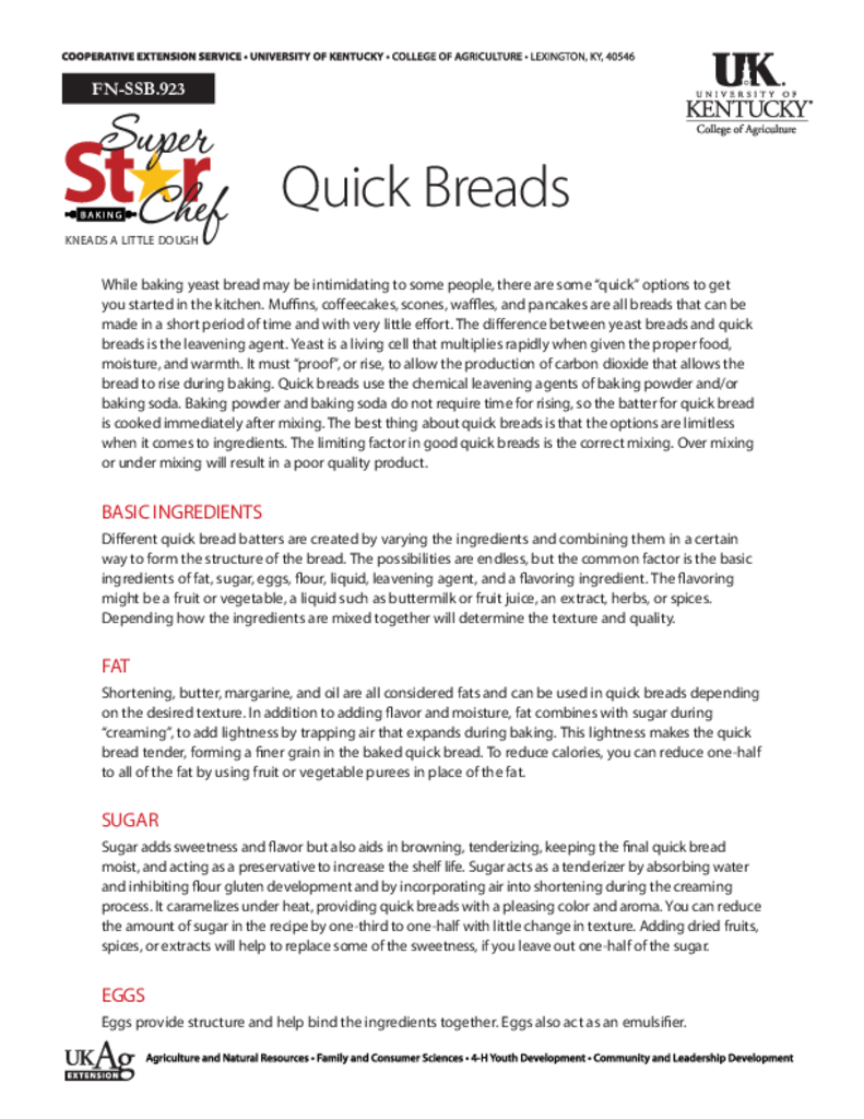 Quick Breads Quick Breads Authored by: Sandra Bastin Download Publication Publication ID FN-SSB.923 Publication Date December 1, 2010 Revision Date December 1, 2014 Contact Tanya Whitehouse Subject Area Baking Publication Supplemental Materials Available! Please login to view supplemental materials.