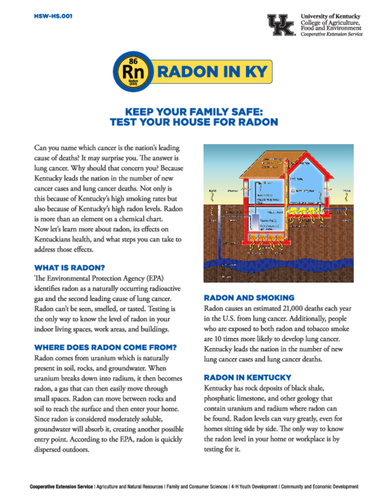 Radon In KY Radon In KY Authored by: Hardin Stephens Download Publication Publication ID HSW-HS.001 Publication Date November 8, 2022 Subject Area General Publication Supplemental Materials Available! Please login to view supplemental materials.