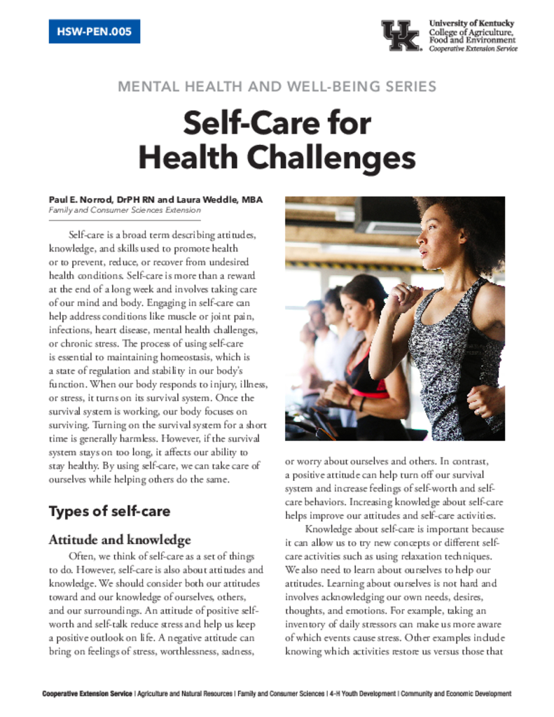 Self-Care for Health Challenges Self-Care for Health Challenges Authored by: Paul Norrod Download Publication Publication ID HSW-PEN.005 Contact Natese Dockery Subject Area Mental Health and Well-Being Series