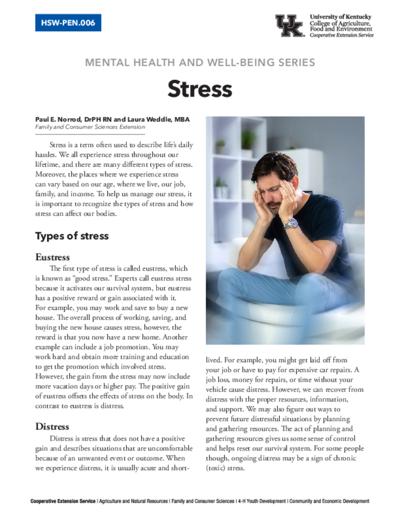 Stress Stress Authored by: Paul Norrod Download Publication Publication ID HSW-PEN.006 Contact Natese Dockery Subject Area Mental Health and Well-Being Series