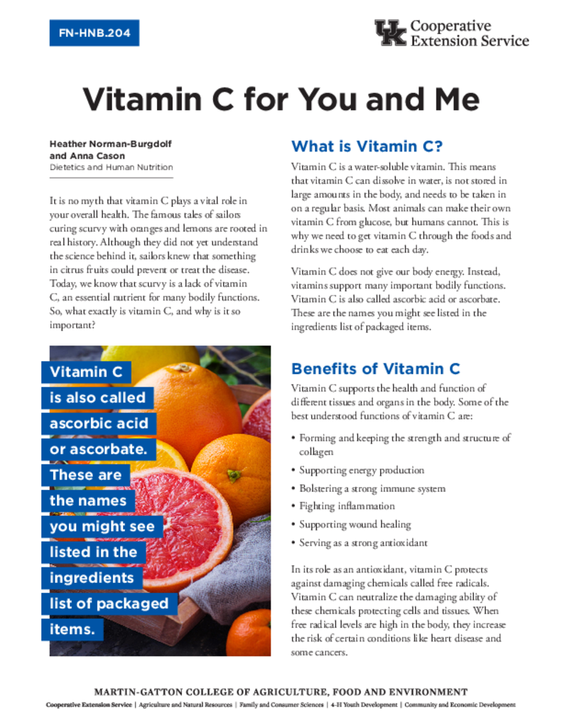 Vitamin C for You and Me Vitamin C for You and Me Authored by: Heather NormanBurgdolf, Anna Cason Download Publication Publication ID FN-HNB.204 Contact Heather Norman-Burgdolf Subject Area Nutrients