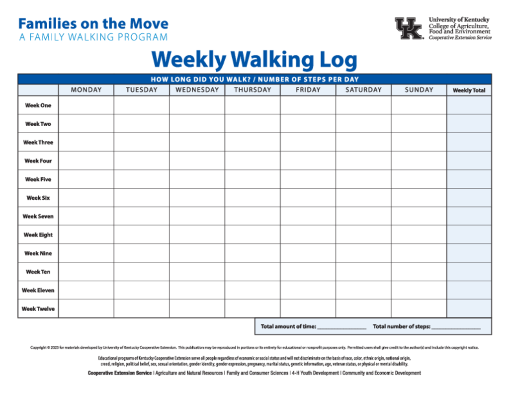 Weekly Walking Log Weekly Walking Log Authored by: Katherine Jury Download Publication Publication ID Contact Katherine Jury Subject Area Families on the Move: A Family Walking Program