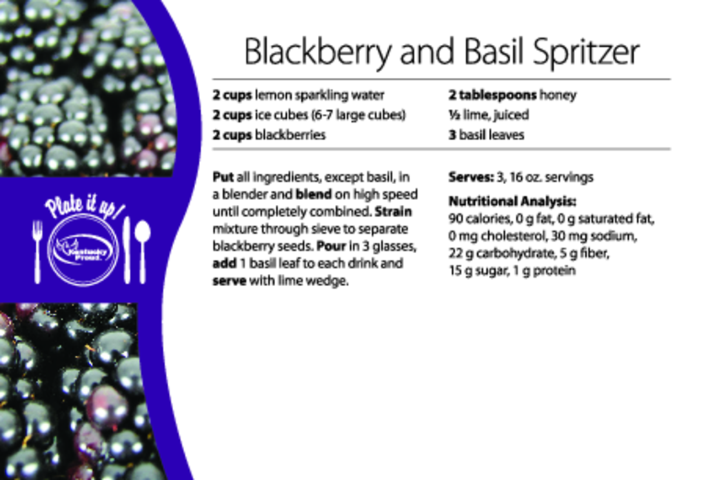 Combine all ingredients, except basil, in a blender and blend on high speed until completely mixed.. Strain mixture through sieve to separate blackberry seeds. Pour in 3 glasses, add 1 basil leaf to each drink and serve with lime wedge.