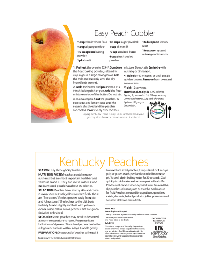 - In a saucepan, heat the peaches, ¾ cup sugar and lemon juice until the sugar is dissolved and the peaches are coated. Pour evenly over the flour mixture. Do not stir. Sprinkle with nutmeg or cinnamon.