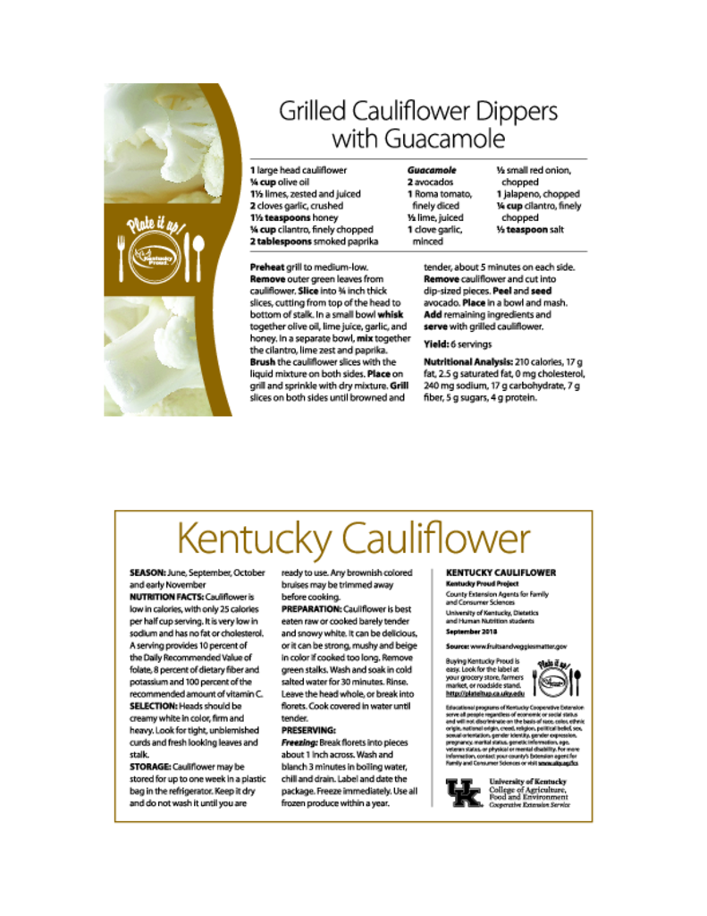 Preheat grill to medium-low. Remove outer green leaves from cauliflower. Slice into 3/4 inch thick slices, cutting from top of the head to bottom of stalk. In a small bowl whisk together olive oil, lime juice, garlic, and honey. In a separate bowl, mix together the cilantro, lime zest and paprika. Brush the cauliflower slices with the liquid mixture on both sides. Place on grill and sprinkle with dry mixture. Grill slices on both sides until browned and tender, about 5 minutes on each side. Remove cauliflower and cut into dip-sized pieces. Peel and seed avocado. Place in a bowl and mash. Add remaining ingredients and serve with grilled cauliflower.